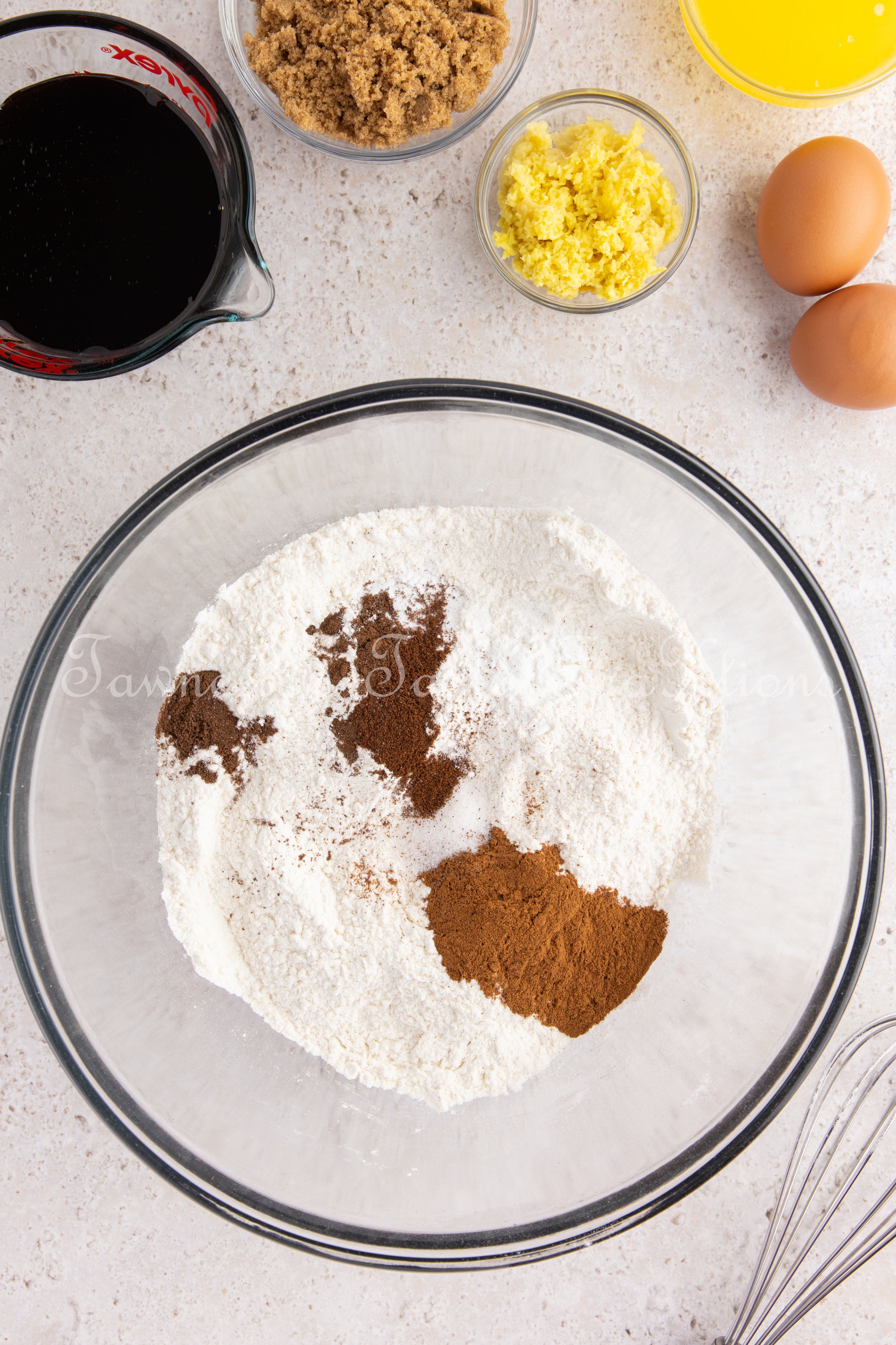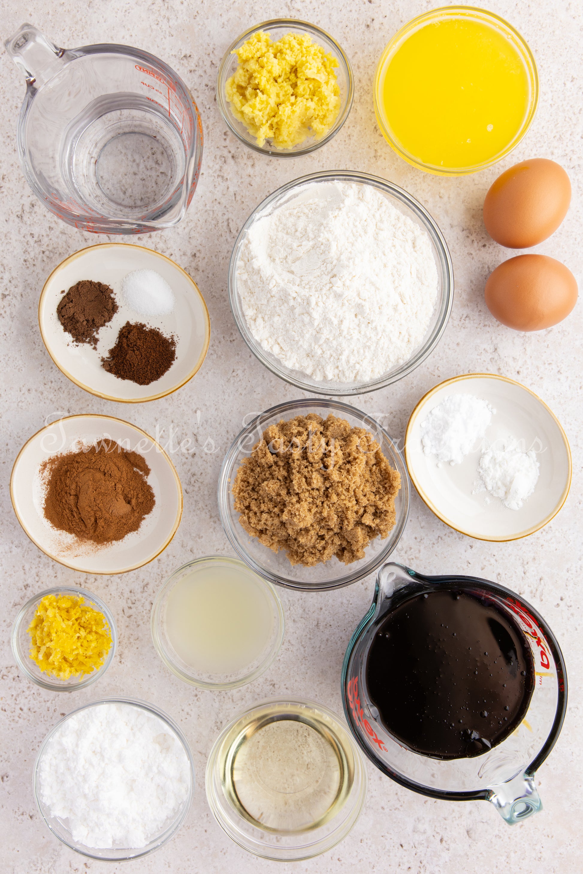 Key Ingredients: flour, molasses, fresh ginger, brown sugar, cinnamon, cloves, allspice, butter; powdered sugar, lemon juice, lemon zest